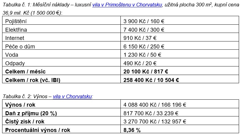 Pro ilustraci v Chorvatsku u luxusní vily s užitnou plochou 300 m2 v Primoštenu s kupní cenou 36,9 mil. Kč (1 500 000 €) sahají měsíční náklady ke zhruba 20 100 Kč (817 €) měsíčně (viz. tabulka). Při realistickém odhadu 58% obsazenosti v průběhu roku lze kalkulovat s čistým výnosem kolem 3 270 700 Kč (132 957 €), tedy 8,36 %.