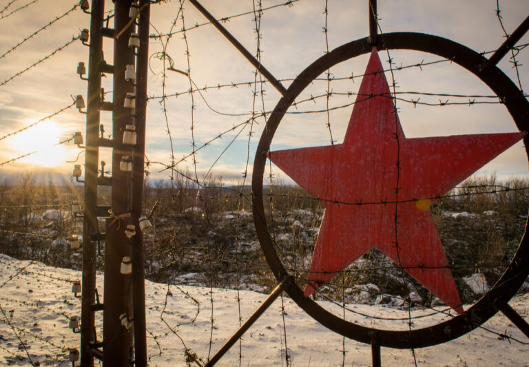 Obrázek 1: Železná opona tvořící neprodyšné hranice mezi kapitalistickým a socialistickým blokem. Rozdělení Evropy, znak srpu a kladiva, bránit emigraci tam, kde existuje soukromé vlastnictví, tam, kde potřeby lidí opečovávaní podnikatelé motivovaní ziskem.