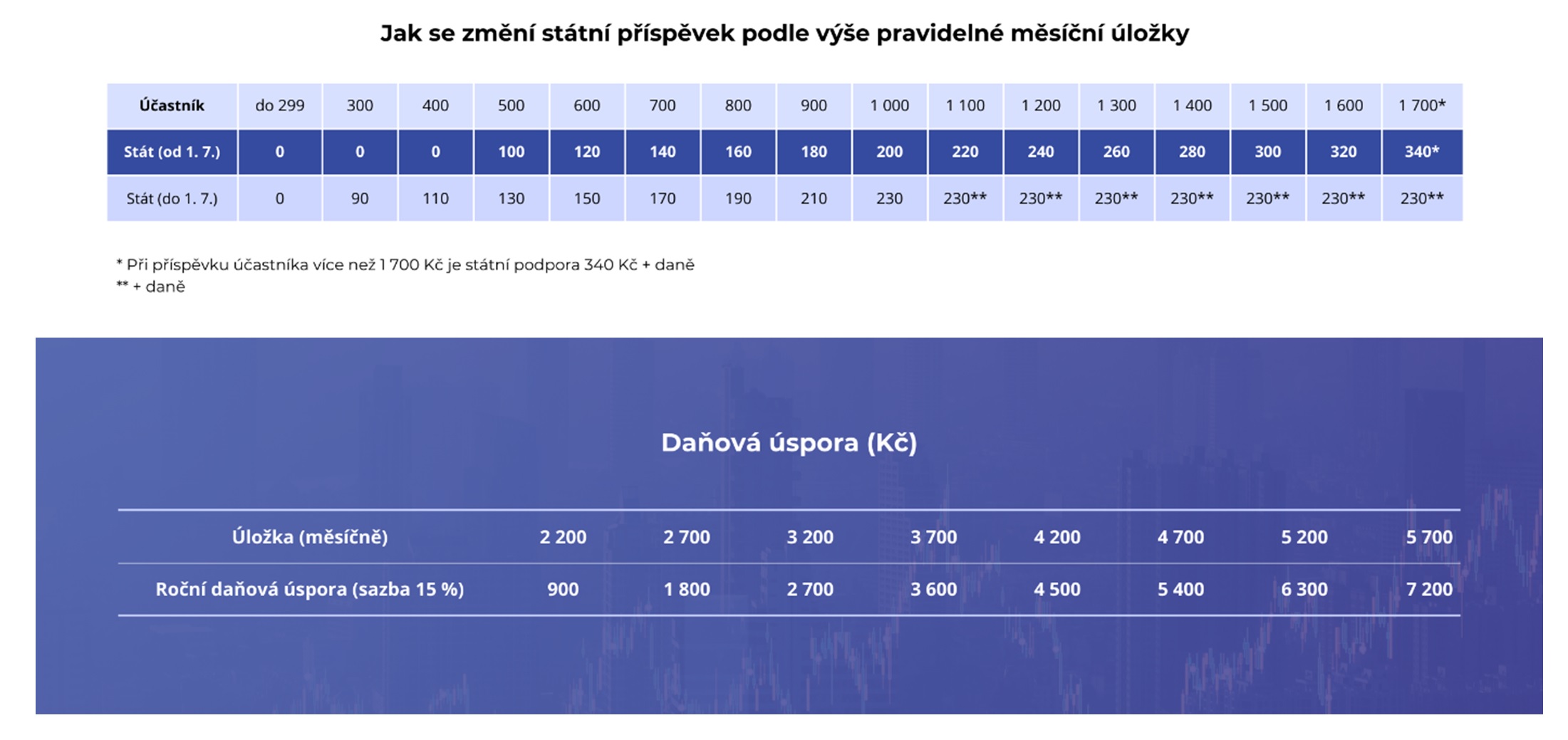 Na dvojnásobek se navyšují daňové odpočty, ročně až na 48 000 Kč, což představuje slevu na dani až 7200 Kč za rok. Do konce června se započítávají pro odpočty platby nad 1000 Kč/měsíc, od července pak nad 1700 Kč/měsíc. Limit 48 000 Kč je společný pro doplňkové penzijní spoření (DPS), penzijní připojištění, životní pojištění i dlouhodobý investiční produkt (viz dále). Při žádosti o odbytné – předčasné vyplacení vlastních naspořených prostředků – je třeba dodanit úlevu za posledních 10 let.