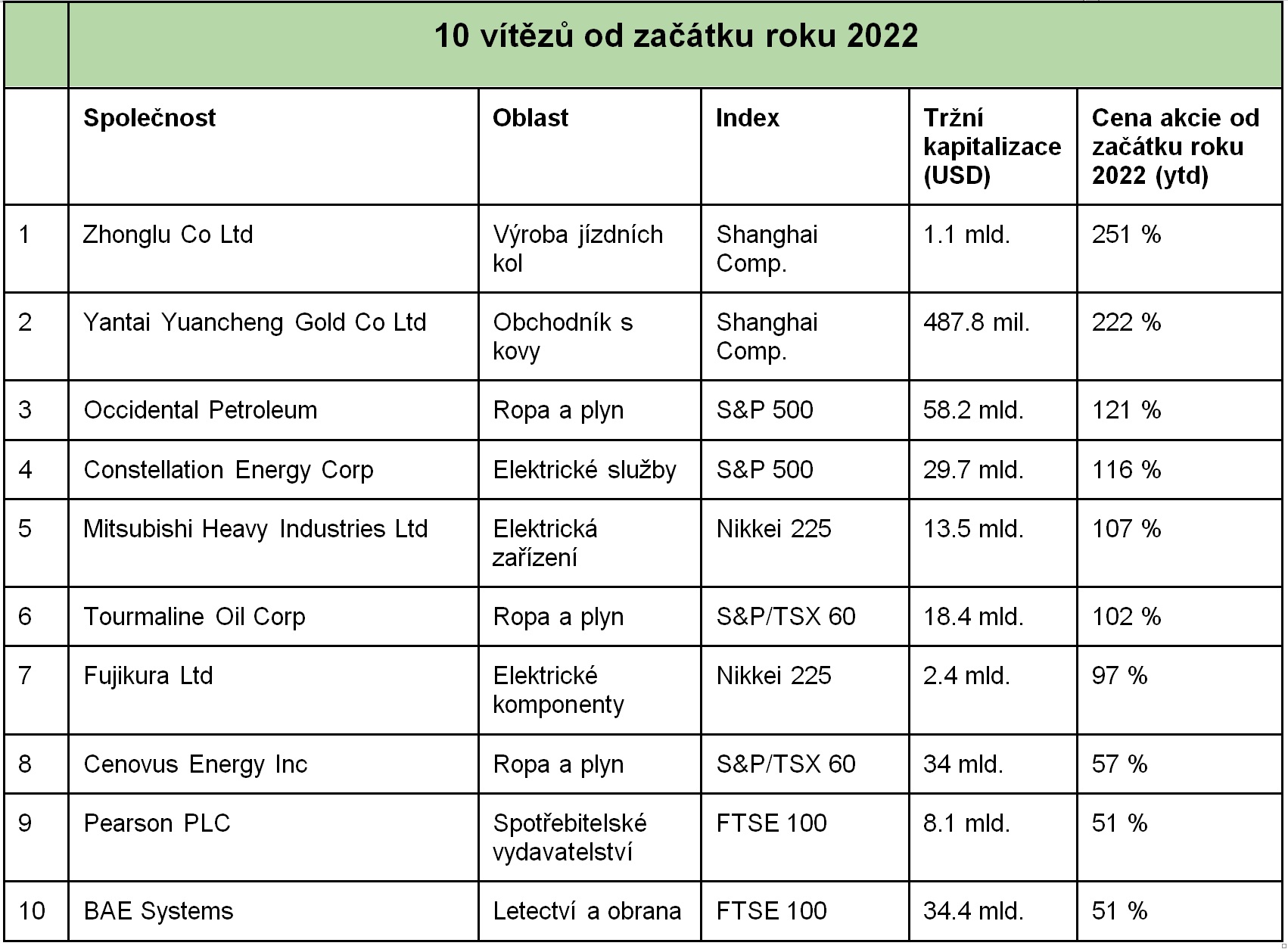 Tabulka ukazuje nejvýkonnější akcie v roce 2022: Dvě nejlepší z hlavních indexů na každém z pěti největších světových akciových trhů.