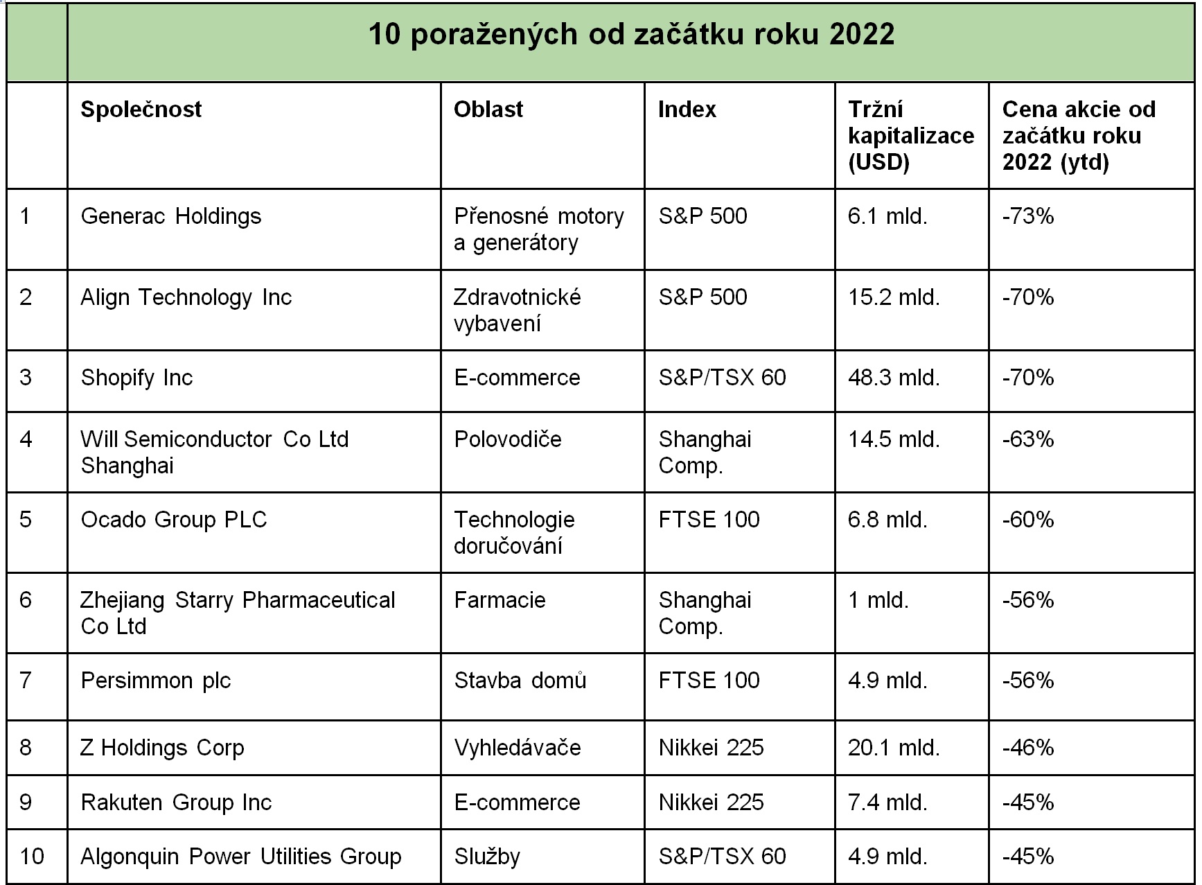 V t0p nejvýkonnějších akcií jsou ropné a plynárenské společnosti a obranný průmysl. Společnosti Occidental, Tourmaline a Cenovus se dostaly na seznam globálních vítězů. Mezi další vítězná jména patří BAE Systems (+51 %) a Pearson (+51 %). Technologie, nemovitosti a e-commerce oslabují. Seznam poražených zahrnuje například Shopify (-70 %), Ocado (-60 %) a Generac Holdings (-73 %).