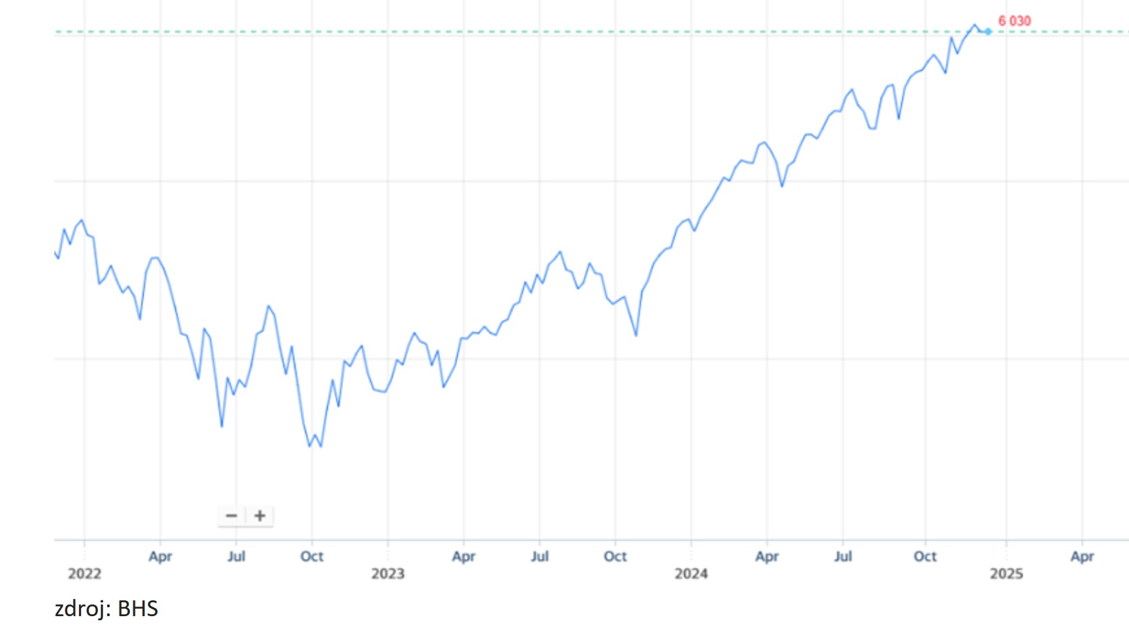 Graf: odhady Wall Street, kam doputuje index S&P 500 v roce 2025