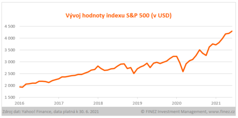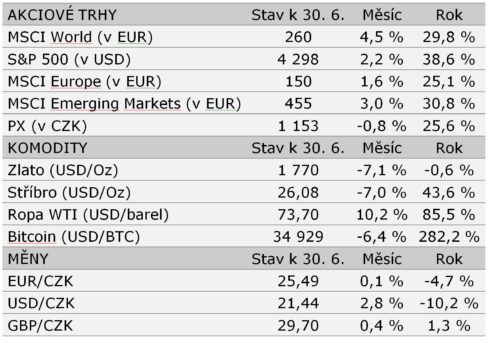 Akciové trhy v červnu prošly drobnou korekcí, ale v závěru měsíce se akciím opět dařilo, což posunulo hodnoty akciových indexů na nová maxima. Index S&P 500 se vyhoupl o další dvě procenta až na 4300 bodů. Hlavní zásluhu na tom po několikaměsíční pauze měly technologické akcie (Apple +10 %, Microsoft +10 %, Tesla +9 %, Amazon +7 %, Facebook +6 %). Naopak nedařilo se bankám (Citigroup -11 %, JP Morgan -6 %, Bank of America -4 %) a ještě větší pokles zaznamenaly akcie těžařů zlata (Barick Gold -15 %, Newmont -14 %).