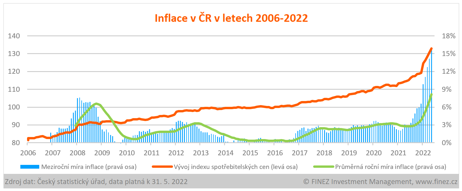 Tempo zdražování se stále ještě zrychluje. V květnu už meziroční míra spotřebitelské inflace v ČR dosáhla 16 %. Ve výrobní sféře dosahuje meziroční zdražení dokonce 28 %. A podobně je na tom celý svět.