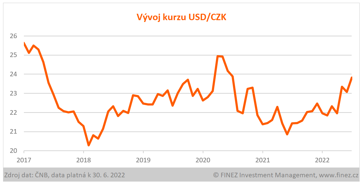 Kurz koruny s eurem se v červnu prakticky nezměnil. Ale výrazněji v červnu posílil dolar k euru, a potažmo tedy i k české koruně, cca o 3 %. Dolar se hodně přiblížil paritě s eurem. Je to vidět i na kurzu koruny, že se euro i dolar pomalu blíží k úrovni 24 korun, akorát každá měna z jiné strany.