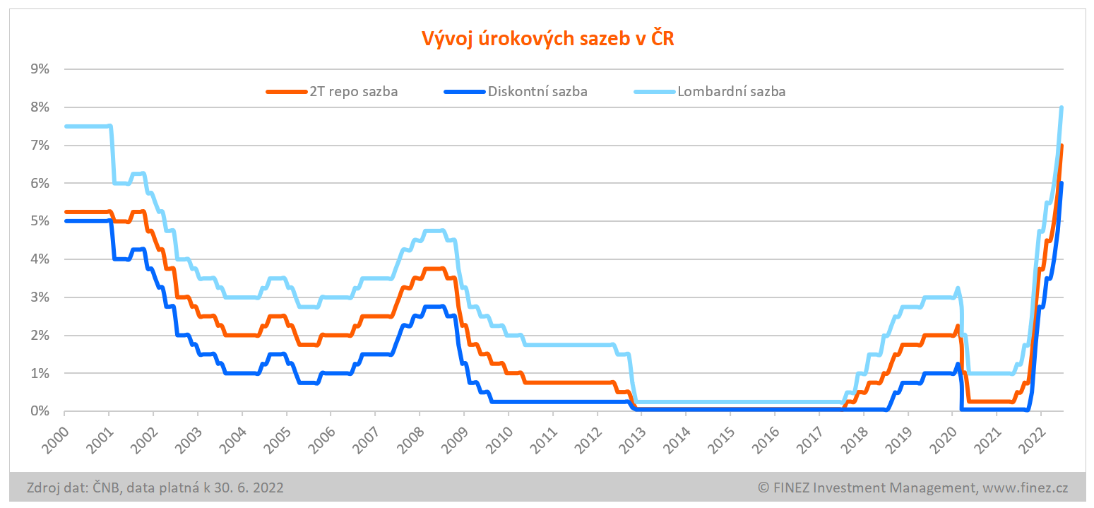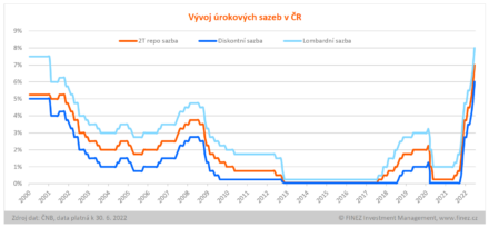 V reakci na stále rostoucí inflaci bankovní rada České národní banky koncem června opět zvýšila úrokové sazby. Základní repo sazba je již na úrovni 7 %. Jednotlivé banky tak postupně dál zvyšují úroky na spořicích účtech, ale také úroky z úvěrů. Během léta se pravděpodobně průměrný úrok u hypoték dostane na 7 – 8 %.