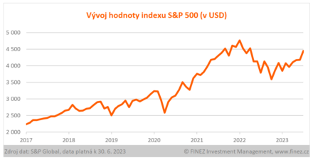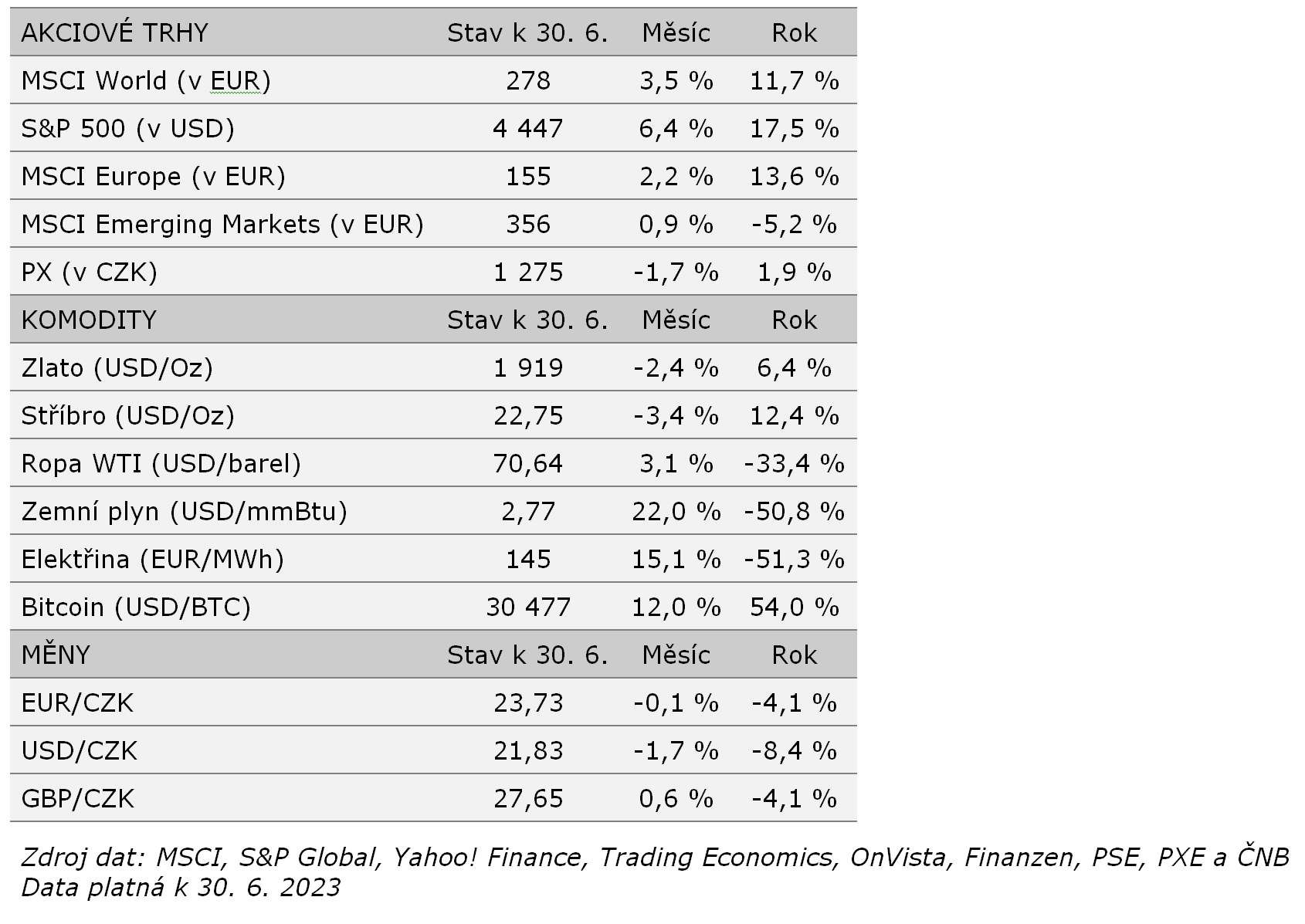 V červnu se velmi dařilo akciím na burzách po celém světě. Hodnota indexu MSCI World stoupla v červnu o 3,5 % a pomalu se blíží svému maximu z konce roku 2021. Hodnota amerického indexu S&P 500 stoupla v červnu dokonce o 6 %. I zde se index nachází už jen zhruba 7 % od svého dosavadního vrcholu z konce roku 2021.