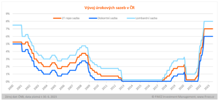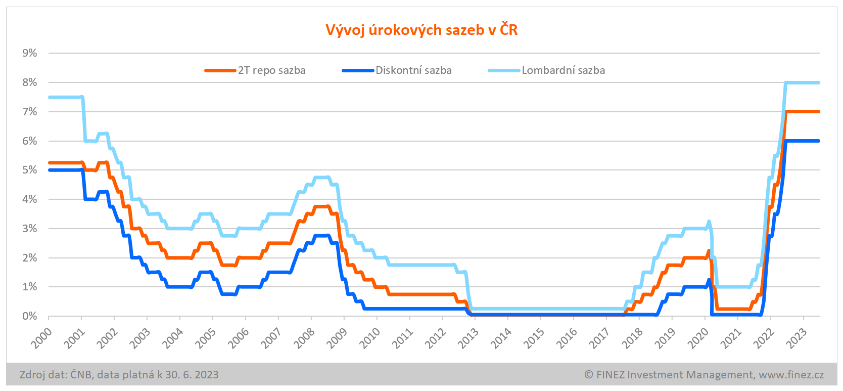 Americký Fed v červnu ponechal úrokové sazby beze změny v pásmu 5-5,25 %. Evropská centrální banka zvedla sazby o 25 bazických bodů, základní repo sazba je nyní 4 %. Česká národní banka ponechala základní repo sazbu na 7 %, kde je už celý jeden rok. Někteří analytici očekávají, že Fed i ECB ještě budou letos sazby mírně zvedat. Jiní se domnívají, že úrokové sazby už dosáhly vrcholu.