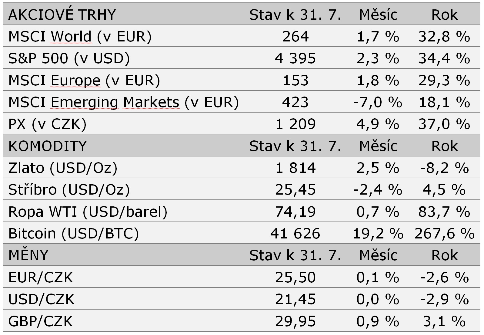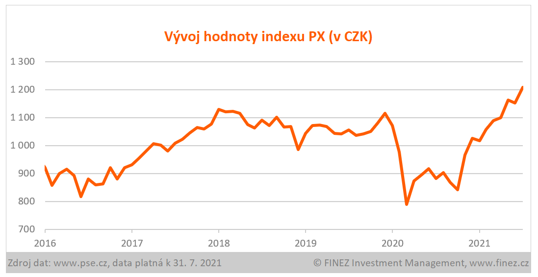 Disclaimer: Článek a informace v něm obsažené nejsou investičním doporučením či analýzou investičních příležitostí ani nepředstavují veřejnou nabídku investičních nástrojů ani jakoukoli jinou nabídku či výzvu vůči veřejnosti k transakci s investičními nástroji. Výkonnost dosažená v minulosti ani očekávaná výkonnost není spolehlivým ukazatelem budoucích výnosů. Data uvedená v článku pochází z webových stránek MSCI, Finance Yahoo!, OnVista, ČNB, PSE a Hypoindex a jsou platná k 31. 7. 2021.