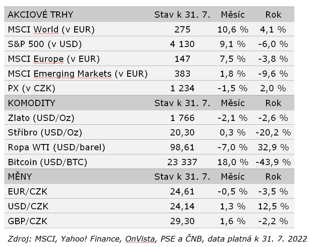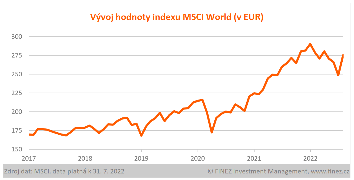 Koncem července jsme mohli pozorovat výrazné oživení na akciových trzích po celém světě, s výjimkou Číny. Hodnota indexu MSCI World stoupla téměř o 11 %. Index MSCI World tvoří akcie 1517 největších veřejně obchodovaných společností z rozvinutých zemí. Zhruba 70 % indexu tvoří americké firmy a zhruba 20 % evropské firmy.
