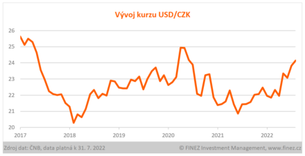 Na měnových trzích došlo v červenci k významné události. Kurz dolaru se dostal až na paritu s eurem, dokonce byl krátce i o pár centů silnější než euro. Ke konci měsíce ale dolar zase mírně oslabil. Každopádně kurz dolaru i eura je teď zhruba stejný, v obou případech něco přes 24 korun za jeden dolar i jedno euro.