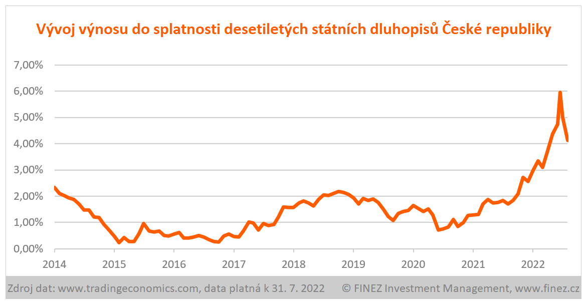 K obratu již zdá se došlo také na českém dluhopisovém trhu. Od poloviny června úrokové výnosy klesají, zejména na delší duraci. Výnos do splatnosti desetiletých českých státních dluhopisů během šesti týdnů klesl z 6 % na 4 % p.a.