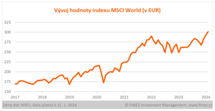 Akciím se v lednu vesměs dařilo. Hodnota většiny akciových indexů třetí měsíc v řadě stoupla. Hodnota indexu MSCI World stoupla o 2,9 % na nové historické maximum, podobně i americký index S&P 500 nebo německý index DAX.