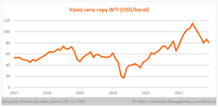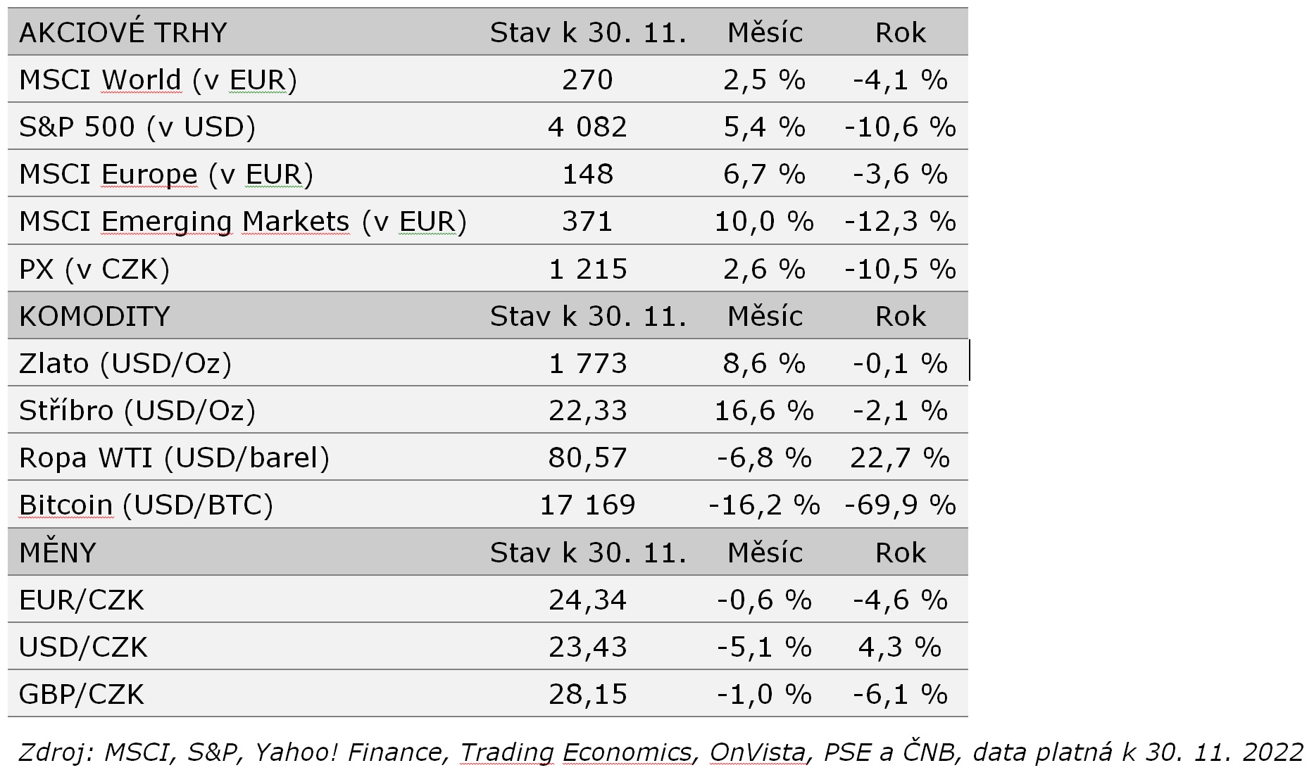Vývoj na trzích v listopadu byl ovlivněn zejména mírným poklesem inflace v USA. V meziročním srovnání spotřebitelských cen je sice míra inflace stále vysoká, ale dynamika inflace během podzimu slábne, tempo zdražování se zpomaluje. Samozřejmě další vývoj inflace je stále nejistý a do značné míry bude nadále záviset na vývoji cen energií a pohonných hmot. Ty poslední měsíce zlevňují, a tak se velmi pesimistické výhledy o vývoji inflace a ekonomiky mění v trochu méně pesimistické.