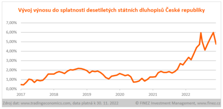 Na dluhopisových trzích došlo v listopadu k výraznějšímu poklesu výnosů do splatnosti, což opět souvisí s aktuálním očekáváním méně agresivního utahování měnové politiky. Kupříkladu výnos desetiletých amerických státních dluhopisů klesl v listopadu ze 4,1 % na 3,7 % p. a. Podobně výnos do splatnosti desetiletých českých státních dluhopisů klesl z 6 % na 4,7 % p. a.