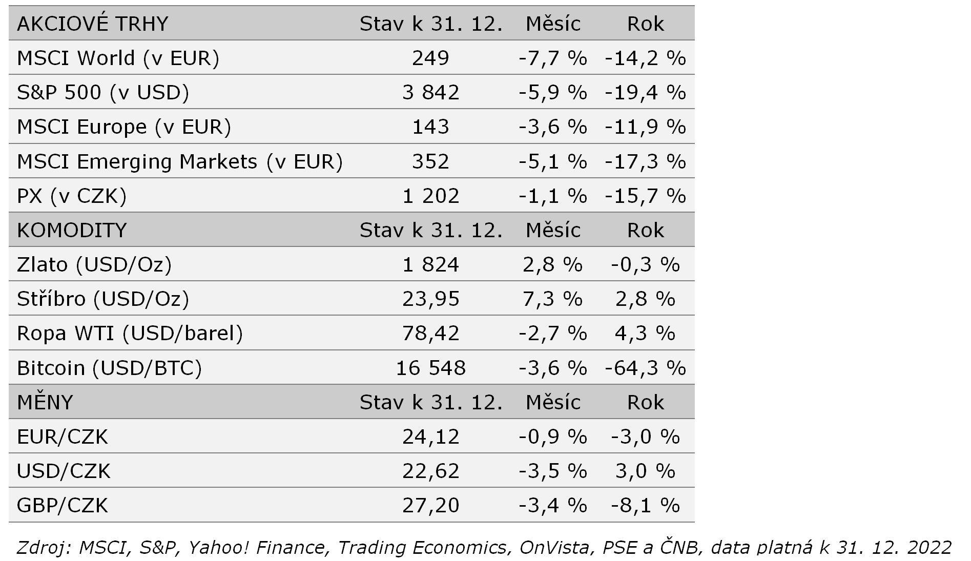 Akciím se v prosinci vůbec nedařilo. Po dvou měsících růstu přišel zase pokles. Hodnota indexu MSCI World klesla o 8 %, a za celý rok tak tento globální akciový index ztratil 14 %. Podobně hodnota amerického indexu S&P 500 v prosinci klesla o 6 % a za celý rok o 19 %. Nedařilo se ani akciím v Evropě, ani na rozvíjejících se trzích.