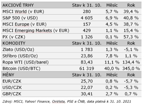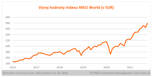 Disclaimer: Článek a informace v něm obsažené nejsou investičním doporučením či analýzou investičních příležitostí ani nepředstavují veřejnou nabídku investičních nástrojů ani jakoukoli jinou nabídku či výzvu vůči veřejnosti k transakci s investičními nástroji. Výkonnost dosažená v minulosti ani očekávaná výkonnost není spolehlivým ukazatelem budoucích výnosů. Data uvedená v článku pochází z webových stránek MSCI, Finance Yahoo!, OnVista, ČNB, PSE a ČSÚ a jsou platná k 31. 10. 2021.