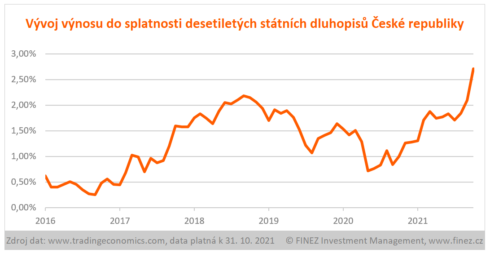 Rostoucí úrokové sazby jsou znát také na dluhopisových trzích. Úrokové výnosy desetiletých českých státních dluhopisů stouply za poslední dva měsíce z 1,8 % p.a. na 2,7 % p.a. Pokud bude ČNB sazby dál zvyšovat, porostou dál i úroky u dluhopisů, a to nejen státních, ale i firemních. To tlačí dolů ceny dříve emitovaných dluhopisů nesoucích nižší úrok. Proto se teď vůbec nedaří dluhopisovým fondům a ještě pár měsíců je asi nečeká dobré období.
