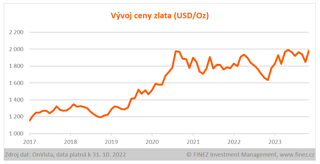 Události na Blízkém východě a vzrůstající geopolitické napětí prospívá zlatu. Cena zlata se v říjnu krátce dostala až na 2000 dolarů za unci. K této hranici se za poslední tři roky přiblížila už několikrát a vždy následně zase korigovala dolů. Uvidíme, jestli tomu tak bude i nyní, nebo zda tentokrát zlato prolomí psychologickou hranici a posune svá maxima výše.