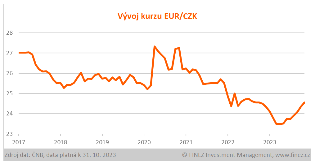 Česká koruna v říjnu dál oslabovala v očekávání, že ČNB brzy začne snižovat úrokové sazby. Kurz eura už se přehoupl přes 24,50 a kurz dolaru přes 23 korun. Dá se předpokládat, že tlak na českou korunu bude nyní nějakou dobu přetrvávat – minimálně do doby, než začnou snižovat úrokové sazby také americký Fed a Evropská centrální banka. A to se zatím zdá v nedohlednu. Nicméně tato situace se může rychle změnit. A také může do hry vstoupit ČNB a intervenovat ve prospěch koruny. Rozhodně se nedá s jistotou říkat, že koruna bude dál oslabovat, má k tomu však nyní všechny předpoklady.