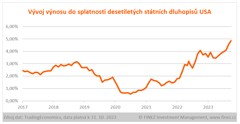 Klesají nadále také ceny dolarových a eurových dluhopisů. Úrokové výnosy desetiletých amerických státních dluhopisů během října krátce stouply až na 5 % p. a. Na této úrovni byly naposledy v roce 2007. Pro řadu penzijních fondů a dalších institucionálních investorů začínají být dluhopisy po 15 letech bídy zase zajímavou investicí. „Big money“ se začínají trochu přesouvat z akcií do dluhopisů. To je ostatně důvod, proč se akciím posledních pár měsíců nedaří.