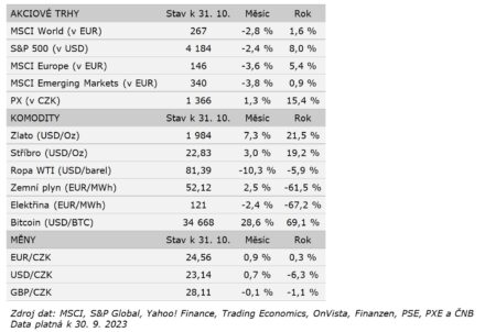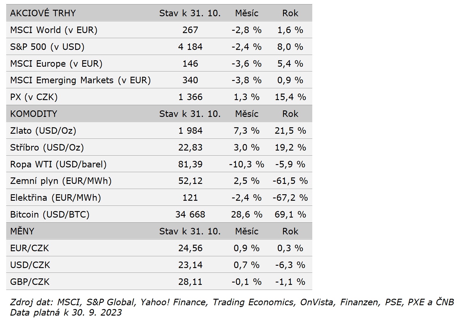 Vývoj na trzích v říjnu byl do značné míry ovlivněn vypuknutím války v Izraeli. Geopolitické napětí ve světě sílí a spolu s tím i obavy investorů. Vyletěla nahoru cena zlata nebo také bitcoinu, naopak akcie pokračovaly v propadu. Také ropa krátce silně podražila, ale v druhé půlce října zase klesla dolů. A stouply úroky dlouhodobých amerických státních dluhopisů.