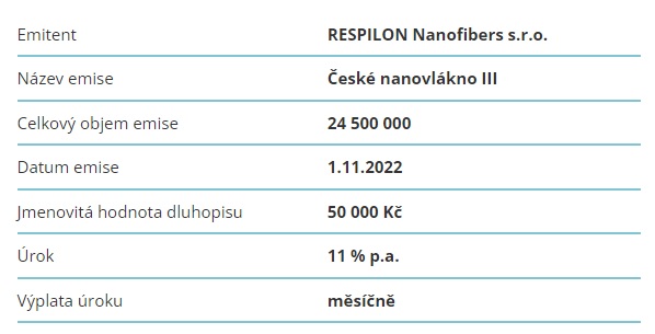 Představujeme další z řady dluhopisů emitovaných společností RESPILON Nanofibers, která se věnuje komercializaci nanovláken. Dluhopisy slouží k financování výroby unikátního kosmetického produktu RespiBeauty a jeho uvedení na světový trh. Emise byla vydána 1. listopadu 2022 a její celkový objem činí 24 500 000 CZK. Jmenovitá hodnota dluhopisu, který je úročen 11 % p. a., je 50 000 korun. Úroky jsou investorům vypláceny pravidelně každý měsíc počínaje datem 1. prosince 2022.