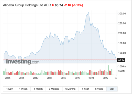 Koncem minulého týdne se akcie Alibaby na newyorské burze obchodovaly pod 64 dolary za akcii. Před zahájením pondělního obchodování odepsaly více než 3 % své hodnoty. Negativní nálada na trzích je tak nadále tlačí dolů. Ještě v říjnu 2020 mohli investoři koupit akcie společnosti za cenu kolem 300 USD za akcii. Podle serveru companiesmarketcap.com byla tržní kapitalizace společnosti na konci října 2022 nižší než 169 miliard USD, zatímco před dvěma lety to bylo 818 miliard USD.