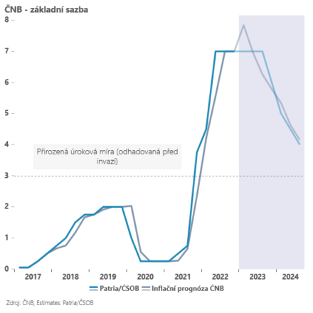 Česká národní banka představila na konci týdne analytikům detailněji svou prognózu i její alternativní scénář. Vše víceméně potvrzuje náš základní scénář, ve kterém předpokládáme delší období stabilních sazeb na úrovni 7,0 % a jejich první pokles až ve čtvrtém kvartále tohoto roku.