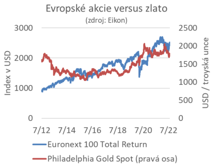 – jeho výnos je dlouhodobě menší než třeba u akcií (i když najdeme víceletá období, kdy se zlatu dařilo líp než akciím, zejm. pokud se budeme dívat na akcie evropské, nikoli americké),