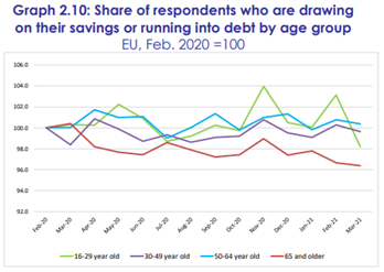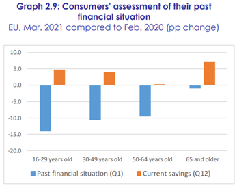 Saldo kladných a záporných odpovědí na otázku ohledně změny osobní finanční situace za posledních 12 měsíců se v březnu 2021 ve srovnání se saldem z března 2020 v EU jako celku zhoršilo nejvíc u lidí ve věku 16-29 let a nejméně u lidí nad 65 let (v následujícím grafu viz modré sloupce). Díky tomu se právě u nejstarších respondentů nejvíc zlepšilo hodnocení jejich momentálního hospodaření v oblasti úspor (viz oranžové sloupce):