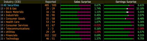 Výsledková sezóna za třetí kvartál letošního roku je téměř u konce. Z indexu S&P odreportovalo 485 společností z 500. Největší překvapení na úrovni tržeb a zisků pro analytiky přinesl sektor Oil & Gas, kdy společnosti z tohoto sektoru odreportovaly tržby v průměru o 1,74 % lepší, než se očekávalo a výnosy dokonce o 15 % lepší nad odhady. Jediné sektory, které zaostaly mírně za odhady, byly spotřebitelské služby a utility na úrovni tržeb, na úrovni zisků pak zklamaly telekomunikace, které dolů zejména táhla společnosti AT&T.