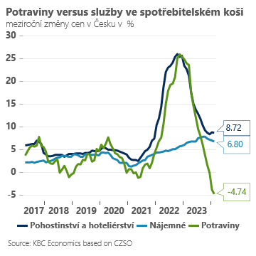 Za pravé, část bankovní rady bude znepokojovat struktura inflace. Celková inflace je sice nízká a během léta se dostane ještě níž (v srpnu předpokládáme hodnoty okolo 1,5 %), do značné míry je to však díky meziročně výrazně zlevňujícím potravinám. Jádrová inflace sice také slábne výrazněji, ale relativně hodně silná zůstává inflace i inflační momentum v segmentu služeb.