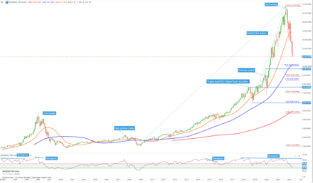 Pokud si myslíte, že propad indexu Nasdaq pod 9000 – případně až na 8500, nebo dokonce 7500 – je hluboký, uvědomte si, že po prasknutí dot-com bubliny se Nasdaq v letech 2000 až 2002 propadl o 77 %. Níže vidíme korekci typu medvědí past, kde RSI testuje hladinu 40. Pokud dojde k uzavření měsíce pod 40, znamená to medvědí trh. Tento scénář tu nebyl od krize subprime hypoték.