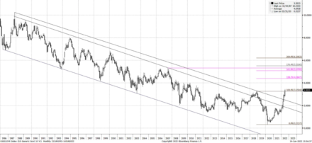 S jen lehkým psychologickým odporem kolem 4 % by mohly americké 10leté vládní dluhopisy ve 3. čtvrtletí klidně dosáhnout 1,382 Fibonacciho projekce kolem 4,38 %. První silnější hladina odporu se však vyskytne až kolem 5,25 %, což je zhruba maximum z doby před krizí subprime hypoték mezi 1,618 a 1,764 Fibonacciho projekce od sestupného trendu z let 2018 – 2020.
