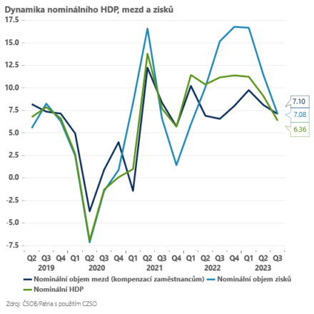 Navíc detaily HDP ukazují, že v ekonomice zvolňuje celkový růst nominálních zisků a mezd. To ukazuje, podobně jako naše odhady založené na anonymizovaných bankovních datech, na pokles dynamiky průměrné mzdy ve třetím kvartále. Pokud také průměrná mzda zvolní výrazněji, než předpokládala listopadová prognóza ČNB (4.12.), může to být pro centrální bankéře další lehce holubičí signál.