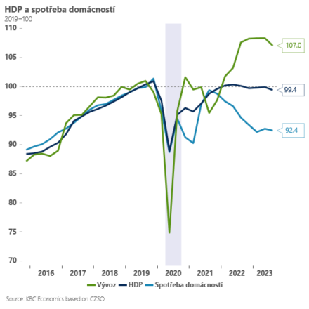 Znepokojivý je také pohled do struktury HDP – mezičtvrtletně padají prakticky všechny složky poptávky, kromě spotřeby vlády. Zatímco u zahraniční poptávky jsme takový vývoj předpokládali, tak pokles spotřeby domácností (-0,3 % mezikvartálně) a zejména investic (taktéž -0,3 %) je pro nás i centrální banku nepříjemným překvapením. Náš hlavní příběh, ve kterém sázíme na oživení poptávky českých domácností v roce 2024, sice neměníme, ale rozjezd domácích útrat bude i podle dnešních čísel velmi pozvolný. Proto jsme se rozhodli snížit naše odhady pro dynamiku české ekonomiky na začátku roku 2024. Ve výsledku tak po dnešních číslech snižujeme náš odhad pro HDP v roce 2023 na -0,5 % (z -0,4 %) a na rok 2024 na 1,4 % (z 1,8 %). Pro rok 2024 stále lehce převažují rizika směrem ke slabšímu výkonu hospodářství.
