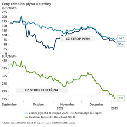 Česká koruna se včera na chvíli dostala pod psychologickou hranici 24,00 EUR/CZK a ukazuje, že na začátku roku přeladila na “překvapivě” pozitivní vlnu. Hlavním důvodem optimismu je podle nás nadále na prvním místě překvapivě teplé počasí, které v posledních dnech tlačí dolů ceny energií a výrazně snižuje pravděpodobnost dalšího vyhrocení energetické krize. Zásobníky plynu zůstávají vysoké a cena plynu i elektřiny dál klesá hlouběji pod českou vládou garantované stropy.