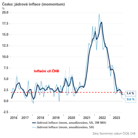 Z pohledu prosincového zasedání může být sice pro část bankovní rady nepříjemné zjištění, že říjnová inflace byla vyšší, než předpokládala listopadová prognóza (8,5 % versus 8,3 % odhadované ČNB). Jde však, jak jsme avizovali, primárně o efekt o něco vyšších cen potravin. Klíčové je, že jádrová inflace, která je zdrojem největších obav v bankovní radě naopak za poslední prognózou zaostala a zvolnila na 4,2 % (nejnižší úroveň od srpna 2021). A ostře sledované momentum jádrové inflace (sezónně očištěný meziměsíční anualizovaný růst jádrových cen) pokleslo výrazně pod dvě procenta (na 0,6 % a tříměsíční průměr na 1,4 %).Je to především důsledek překvapivého poklesu cen v sekci kultura a rekreace, a také zvolňování cenové dynamiky v pohostinství a hoteliérství. Pro centrální banku je toto bezesporu holubičí signál, který v kombinaci s posledními slabšími čísly z maloobchodu stále nechává ve hře první pokles sazeb v tomto roce.