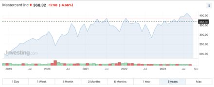 Graf: Vývoj hodnoty akcií společnosti Mastercard za posledních 5 let (Zdroj: Investing.com)*