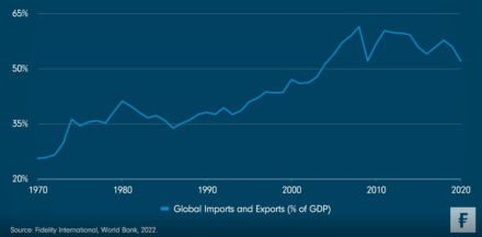 Obchodní napětí mezi USA, Čínou a dalšími významnými obchodními zeměmi vedlo od finanční krize v roce 2008 k relativnímu poklesu úrovně globálního dovozu a vývozu. Důsledky pandemie Covid-19 tento proces urychlily a zároveň donutily podniky a vlády zvážit své regionální závislosti, protože globální dodavatelské řetězce se dostaly pod větší tlak. Invaze Vladimira Putina na Ukrajinu a následné sankce namířené proti Rusku tento trend deglobalizace pravděpodobně ještě prohloubí.