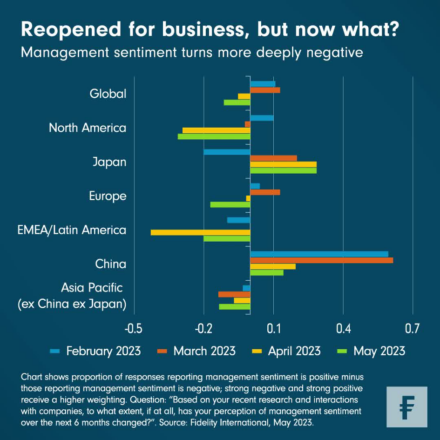 Nejnovější měsíční průzkum analytiků společnosti Fidelity International ukazuje pokračující zhoršení manažerského sentimentu, vedené výrazným poklesem u čínských a evropských společností. Zdá se, že čínské znovuotevření trhu uvadá, a i nad evropským makroekonomickým výhledem se stahují mračna.