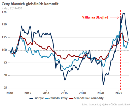Začněme vývojem na globálních komoditních trzích, které prožily mohutnou rally již v roce 2021 díky post-covidovému boomu, přičemž trend dále akceleroval – zvláště v případě energií – začátek války na Ukrajině. Od té uběhne v příštím týdnu rok, avšak oproti svému vrcholu je souhrnný energetický index aktuálně o více než třetinu níže. V případě zemědělských komodit jde přibližně o 15% pokles, zatímco základní kovy – které v posledních měsících povzbudilo otevření čínské ekonomiky – odepsaly asi 20 %.