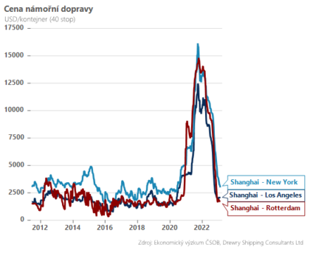 Ještě významnější úleva je pak cítit na straně fungování globálních dodavatelských řetězců. Připomeňme, že ty se dostaly pod tlak zejména z důvodu přísných lockdownů v jihovýchodní Asii, která stojí na začátku nemalé části dodavatelských řetězců. Úzkým hrdlem se staly největší regionální přístavy, což reflektoval prudký nárůst nákladů námořní dopravy – cena za lodní kontejner ze Šanghaje do Evropy, případně USA zdražila i více než desetinásobně. Současné ceny jsou však již velmi blízko před-pandemickým úrovním, přičemž opuštění politiky nulové tolerance v Číně by mělo dále pomoci normalizovat situace na straně nabídky.
