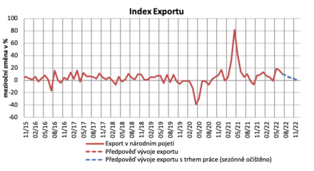 Růst hodnoty vývozů dosáhl v srpnu meziročně +10,2 %, mírně nad predikcí indexu exportu, která se pohybovala poblíž +8 %. Nicméně růst nejde čistě na vrub objemu vyvezeného zboží, ale především růstu vývozních cen, které byly v srpnu meziročně vyšší o 14,2 %. Do konce roku index exportu i nadále predikuje postupně oslabující meziroční dynamiku hodnoty vývozů, která se koncem roku přibližuje k nule.