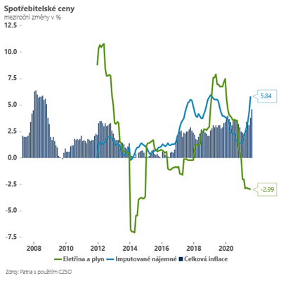Rychle rostoucí ceny stavebních materiálů se také promítají do rychlého zdražování oprav a vybavení bytů a domů. A dalším tahounem inflace zůstávají ceny potravin (zejména máslo a vejce) a v oddíle doprava ceny pohonných hmot (+19% meziročně) . V průběhu podzimu může sice lehce odeznívat vliv dražších pohonných hmot, na druhé straně se teprve začne naplno projevovat dražší elektrická energie. Ta dnes meziročně zlevňuje o zhruba 3% (zemní plyn ještě více), to se však brzy změní. To pravděpodobně vytáhne českou inflaci ke konci roku do blízkosti 5%.