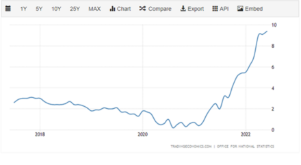 Británie se „chlubí“ nechtěným rekordem. V červnu dosáhla míra inflace v zemi nejvyšší úrovně za posledních čtyřicet let, konkrétně od roku 1982. Meziroční tempo růstu se vyšplhalo na 9,4 %. V květnu to bylo 9,1 procenta. Podle britského statistického úřadu to bylo způsobeno především růstem cen energií a pohonných hmot.