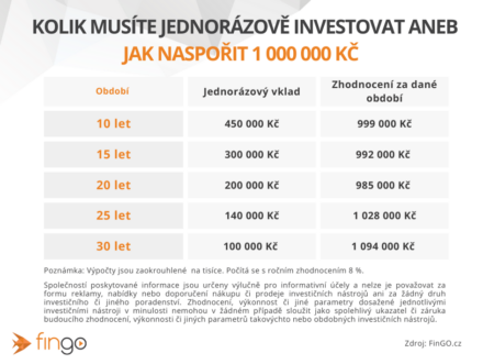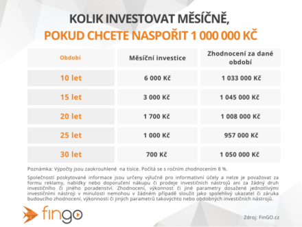 Pokud tolik peněz nechcete nebo nemůžete jako počáteční investici dát, ideální možností je investovat pravidelně po měsících. Nezdá se to, ale při předpokládaném ročním zhodnocení 8 % se i z tisícovky měsíčně za 25 let takřka milion vyklube.