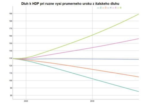 Strach na trzích má ale jinou povahu než před víkendem, kdy se investoři primárně strachovali o italské veřejné finance. S pádem projektu “populistické” vlády je toto nebezpečí o něco méně akutní. Těžko si představit, že by už rozpočet na rok 2019 byl připraven jako výrazně expanzivní. A současný nárůst výnosů by italskou dluhovou trajektorii také neměl zasáhnout příliš negativně – průměrný výnos z italského veřejného dluhu je v tuto chvíli stále výrazně nad 3 % a dražší financování by se na italském dluhu promítalo jen velmi pozvolna (viz scénáře níže).