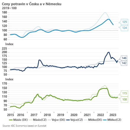 A za druhé, při pohledu do zpětného zrcátka se zdá, že od roku 2019 se nevyvíjely ceny hlavních potravin dramaticky odlišně od sousedního Německa (viz grafy). Ceny zemědělské produkce se postupně jak v Česku, tak v Německu odrážely v podobné intenzitě ve výrobním řetězci a následně i na pultech obchodů. Potraviny tak v průměru oproti roku 2019 zdražily zhruba o 35 % jak v Česku, tak i v Německu. Rozdíly v cenách některých produktů, které pozorují při přeshraniční turistice čeští spotřebitelé, tak tady byly s vysokou pravděpodobností již před pandemií covidu. U některých produktů (tuky a oleje) sice rostly ceny na pultech v Česku o něco výrazněji, než ukazují ceny zemědělců i pohyb cen v Německu, v případě jiných produktů (například masné výrobky) je tomu ovšem naopak. A k podobnému závěru ve svém šetření pravděpodobně dospěl u hlavních potravin i Úřad pro ochranu hospodářské soutěže.